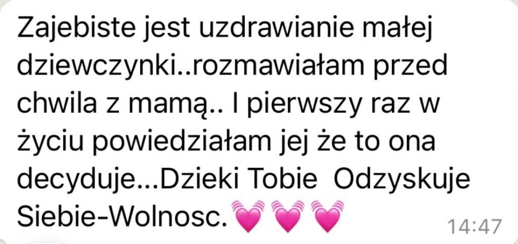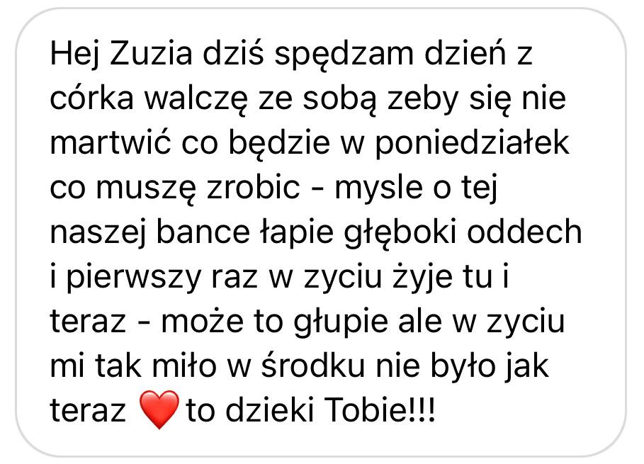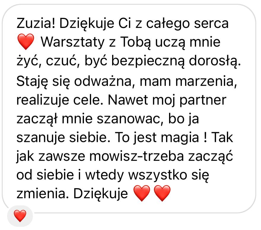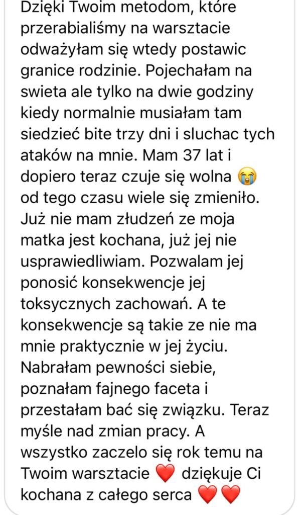 Studia coachingu, terapii w nurcie analizy transakcyjnej i psychologii procesu pozwoliły mi na wypracowanie własnych narzędzi, ale dopiero rozwód był moim momentem przebudzenia. Wtedy zrozumiałam, że moje dzieciństwo wciąż trzyma mnie za rękę i prowadzi w stare schematy. Dopiero gdy przestałam uciekać i spojrzałam w siebie - skorzystałam z narzędzi, które dziś krok po kroku przekazuję Tobie - poczułam wolność, o jakiej wcześniej tylko czytałam: wolność do bycia sobą, do mówienia „nie”, do życia po swojemu.